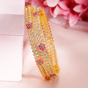 Adorn your wrist with finest handcrafted gold plated bangles studded with color stones. Pair it up and flaunt with your ethnic attire. Occasion : Bring your style to a whole new level with this handcrafted piece of jewelry. When you’re celebrating a special Occasion : – a birthday, wedding, or personal milestone – this piece adds that extra something that makes us feel special and looking our best. Material & Care It is advisable to avoid contact with water and organic chemicals i.e. perfume sprays. Store jewelry in airtight box Material: Brass Net Weight: 32.62 Gram Net Quantity: 2 Bangles Care Label: It is advisable to avoid contact with water and organic chemicals i.e. perfume sprays. Store jewellery in airtight box. After use, wipe the jewellery with soft cotton cloth.