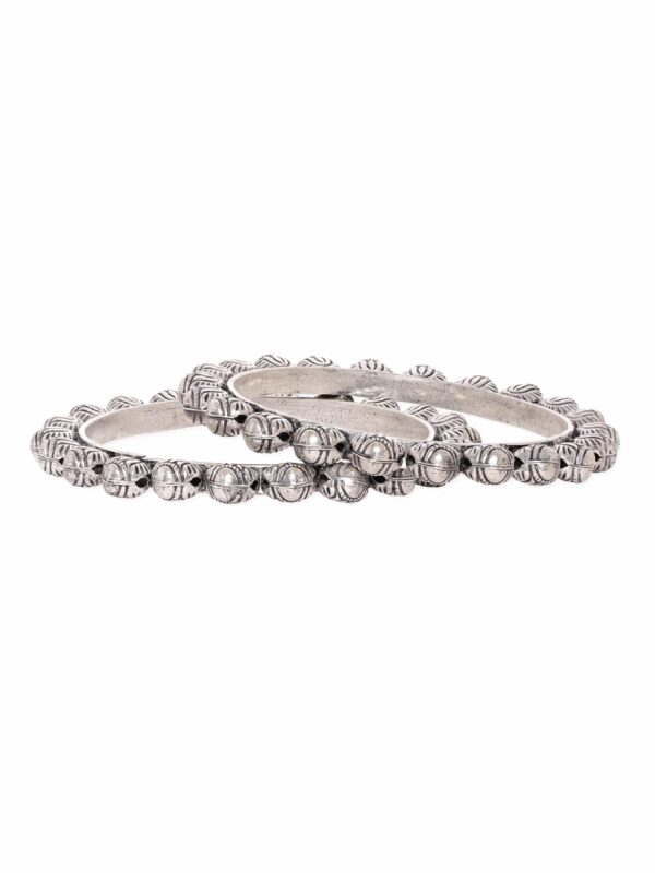 This set features two beautifully handcrafted bangle bracelets, each adorned with exquisite oxidized silver plating. The artisanal touch and the oxidized finish infuse a sense of opulent beauty into these pieces, making them versatile accessories suitable for various occasions. With their intricate craftsmanship and enduring design, these bangles add an element of sophistication to your jewelry collection. Wear them individually for a subtle elegance or stack them together for a more pronounced statement. Embrace the allure of oxidized silver with this artisan-crafted duo, promising a touch of vintage-inspired charm to any ensemble. Material & Care Material : Brass Collection : Oxidized Care Label : It is advisable to avoid contact with water and organic chemicals i.e. perfume sprays. Store jewellery in airtight box. After use, wipe the jewellery with soft cotton cloth.