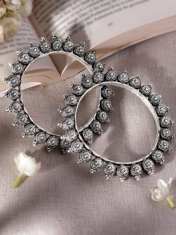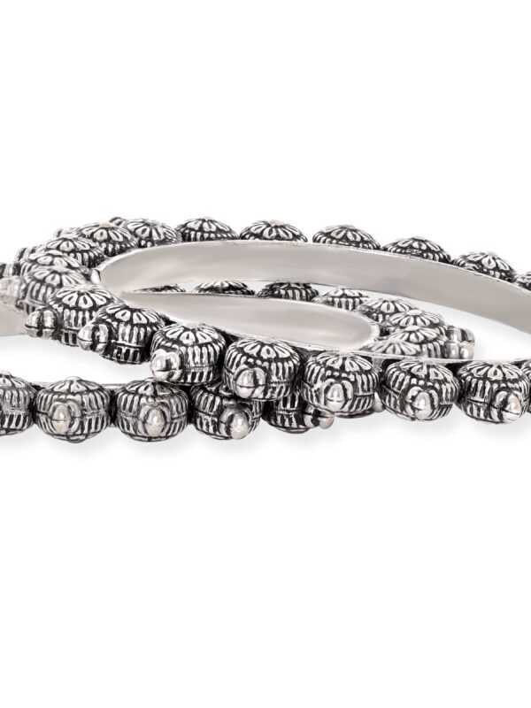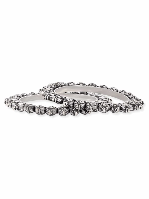 This set includes two exquisite bangle bracelets, each adorned with a delicately crafted lotus motif in oxidized silver plating. The lotus, symbolizing purity and enlightenment, adds a meaningful touch to these pieces. The oxidized finish imparts a sense of vintage charm, making them versatile accessories suitable for various occasions. Material & Care Material : Brass Care Label : It is advisable to avoid contact with water and organic chemicals i.e. perfume sprays. Store jewellery in airtight box. After use, wipe the jewellery with soft cotton cloth.