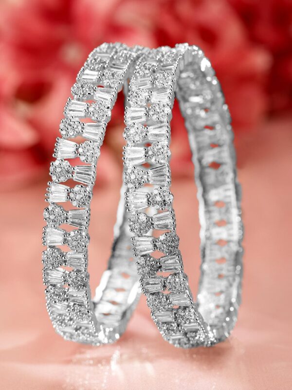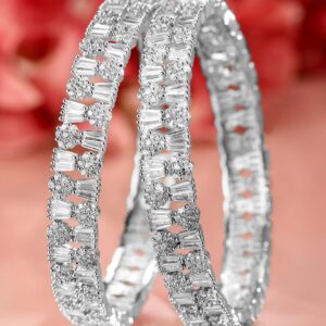 Bangle : These Rhodium-plated bangles feature handcrafted AAA cubic zirconia stones in a sleek and elegant design. Perfect to add a touch of sophistication to any outfit, whether traditional or modern. Occasion : Bring your style to a whole new level with this handcrafted piece of jewellery. When you’re celebrating a special Occasion : – a birthday, wedding, festive or personal milestone – this piece adds that extra something that makes us feel special and looking our best. Material & Care Material: Brass Plating : Rhodium Plated Net Weight: 47.88 Gram Net Quantity: 2 Bangles Care Label : It is advisable to avoid contact with water and organic chemicals i.e. perfume sprays. Store jewellery in airtight box. After use, wipe the jewellery with soft cotton cloth.