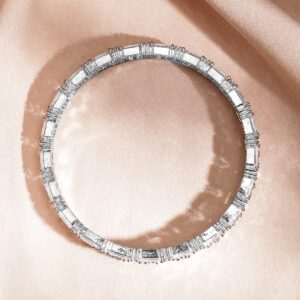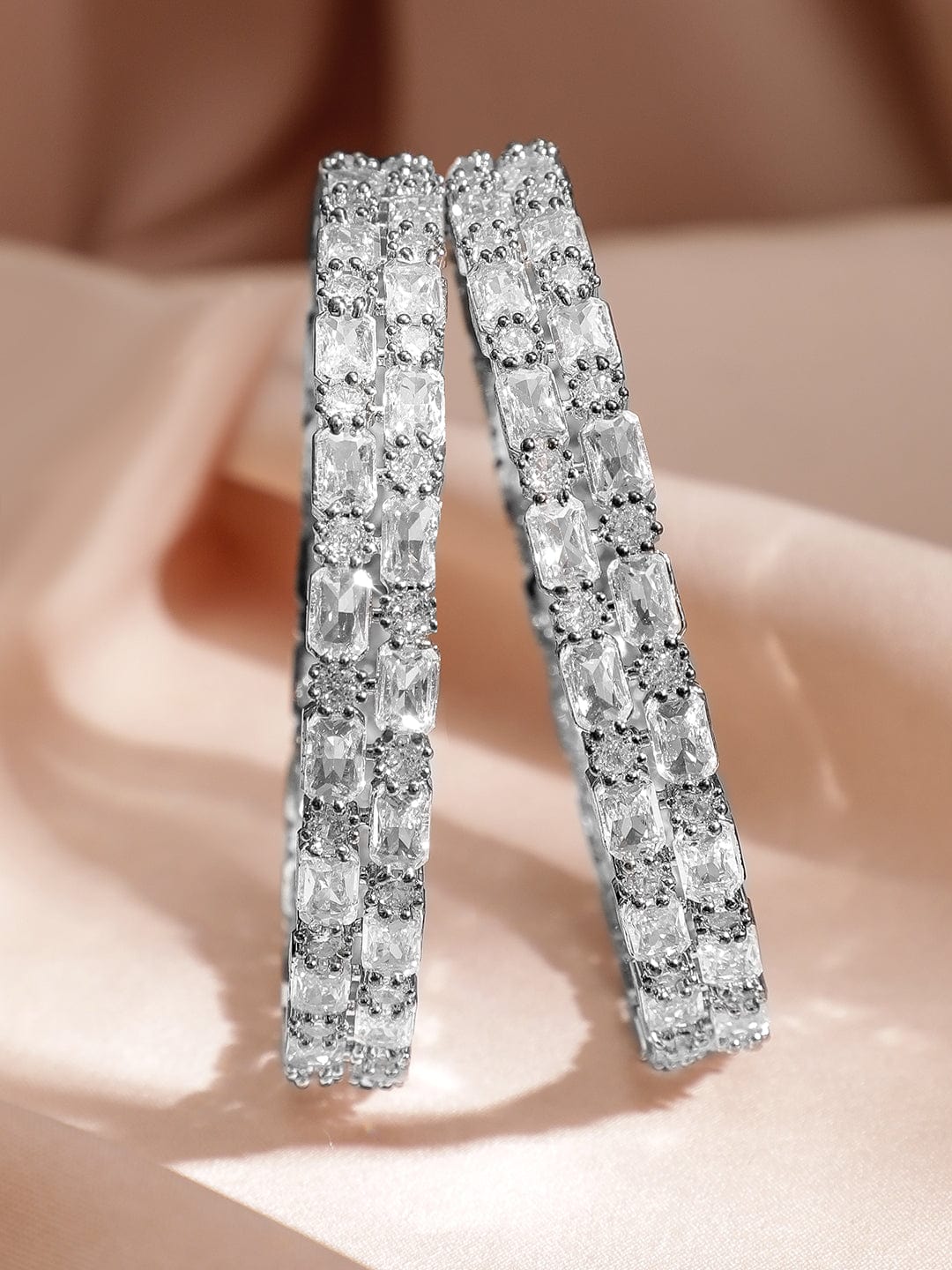 A stunning set of 2 rhodium-plated bangles, elegantly studded with white American Diamonds and Cubic Zirconia stones, designed to add a sparkling charm to your look. Material: Wipe with a clean, dry cloth to remove dust