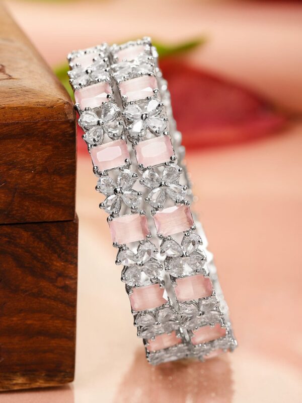 Bangle :Gracefully crafted rhodium-plated bangles featuring pastel pink stones accented with shimmering cubic zirconia, exuding a blend of charm and sophistication. Occasion : Bring your style to a whole new level with this handcrafted piece of jewellery. When you’re celebrating a special Occasion : – parties, festive, wedding, or personal milestone – this piece adds that extra something that makes us feel special and looking our best. Material & Care Material: Brass Plating : Rhodium Plated Net Weight: 43.46 g Net Quantity: 2 Bangles Care Label : It is advisable to avoid contact with water and organic chemicals i.e. perfume sprays. Store jewellery in airtight box. After use, wipe the jewellery with soft cotton cloth.
