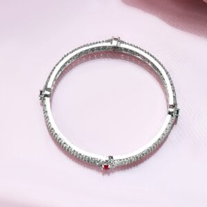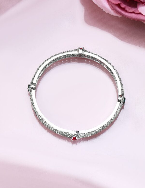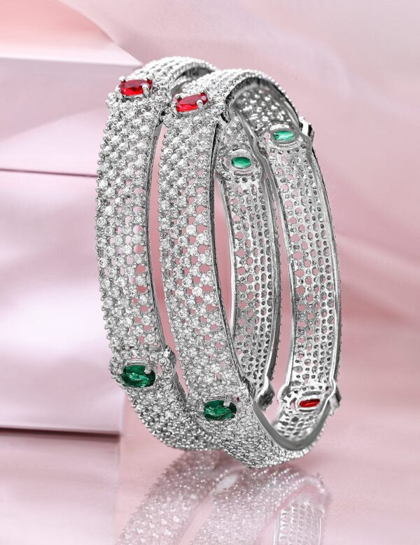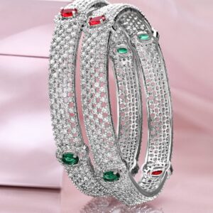 Bangle : Discover elegance with the Rhodium-Plated design, meticulously crafted for those who cherish luxury. This piece features Ruby and Emerald stones for an eye-catching sparkle, making it perfect for special occasions. With a blend of high-quality materials and exquisite design, it promises both durability and style. The versatile look can complement a variety of outfits, adding a touch of sophistication. A must-have for enhancing your accessory collection with timeless elegance. Occasion : Bring your style to a whole new level with this handcrafted piece of jewellery. When you’re celebrating a special Occasion : – a birthday, wedding, or personal milestone – this piece adds that extra something that makes us feel special and looking our best. Material : & Care Material: Brass Net Weight: 81.73 Gram Net Quantity: 2 Bangles Care Label: It is advisable to avoid contact with water and organic chemicals i.e. perfume sprays. Store jewellery in airtight box. After use, wipe the jewellery with soft cotton cloth.