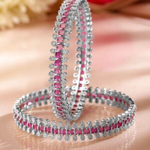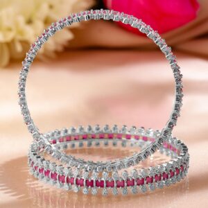 A premium set of 2 rhodium-plated bangles, beautifully studded with ruby pink and white cubic zirconia. Designed for elegance and grandeur, these bangles bring a luxurious statement to any look. Occasion : Bring your style to a whole new level with this handcrafted piece of jewellery. When you’re celebrating a special Occasion : – a birthday, wedding, or personal milestone – this piece adds that extra something that makes us feel special and looking our best. Material : & Care Net Weight: 53g Net Quantity : 2 Bangles Material :Brass Care Label : It is advisable to avoid contact with water and organic chemicals i.e. perfume sprays. Store jewellery in airtight box. After use, wipe the jewellery with soft cotton cloth.