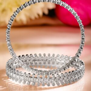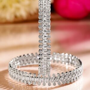 This set of 2 rhodium-plated bangles features exquisite white cubic zirconia stones, enhancing their timeless elegance. The intricate handcrafted design with shimmering embellishments makes them ideal for festive and wedding looks. Occasion : Bring your style to a whole new level with this handcrafted piece of jewellery. When you’re celebrating a special Occasion : – a birthday, wedding, or personal milestone – this piece adds that extra something that makes us feel special and looking our best. Material : & Care Material: Brass Net Weight: 45.9 g Net Quantity: 2 Bangles Care Label : It is advisable to avoid contact with water and organic chemicals i.e. perfume sprays. Store jewellery in airtight box. After use, wipe the jewellery with soft cotton cloth.