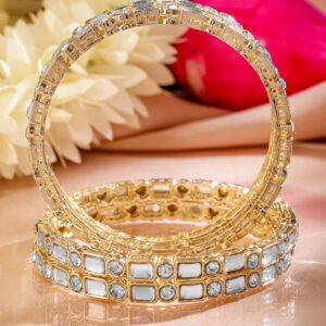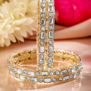 Bangles & Bracelet : This set of 4 handcrafted bangles features brilliant AD stones and mirror embellishments in a regal 18K gold-plated finish, making them the perfect accessory for weddings and festive occasions. Occasion : Bring your style to a whole new level with this handcrafted piece of jewellery. When you’re celebrating a special Occasion : – a birthday, wedding, or personal milestone – this piece adds that extra something that makes us feel special and looking our best. Material : & Care Net Weight: 53g Net Quantity : 4 Bangles Material :Brass Care Label : It is advisable to avoid contact with water and organic chemicals i.e. perfume sprays. Store jewellery in airtight box. After use, wipe the jewellery with soft cotton cloth.
