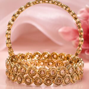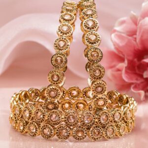 Bangle : Set of 4 bangles crafted in 18K gold plating and studded with light peach cubic zirconia stones in circular motifs—ideal for bridal wear, festive styling, and ethnic occasions. Ideal for Grand Occasions: Perfect for bridal wear, ethnic functions, or festive events, these bangles elevate any saree or lehenga look with dazzling sparkle and luxurious heritage charm. Material : & Care Dimension : Net Weight: 69.27 Gram Net Quantity: 4 Bangles Material : Brass Care Label : It is advisable to avoid contact with water and organic chemicals i.e. perfume sprays. Store jewellery in airtight box. After use, wipe the jewellery with soft cotton cloth.