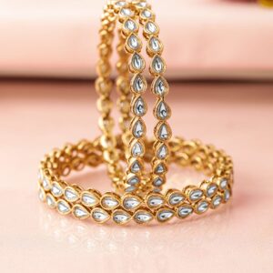 Bangle : Elevate your ethnic ensemble with ‘ set of 4 bangles. Crafted in 18K Mehandi gold plating, these bangles feature intricate Kundan stones for a regal, timeless look. Occasion : Bring your style to a whole new level with this handcrafted piece of jewellery. When you’re celebrating a special Occasion : – a birthday, wedding, festive or personal milestone – this piece adds that extra something that makes us feel special and looking our best. Material : & Care Dimension : Net Weight: 68.48 g Net Quantity: 4 Bangles Material : Brass Care Label : It is advisable to avoid contact with water and organic chemicals i.e. perfume sprays. Store jewellery in airtight box. After use, wipe the jewellery with soft cotton cloth.