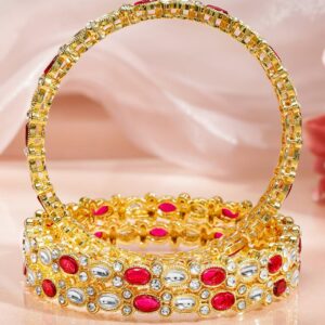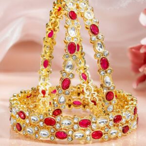Bangle : This set of 4 bangles features ruby pink and white kundan stones highlighted with sparkling cubic zirconia, all finished in 18K mehandi gold plating—perfect for bridal wear and festive celebrations. Perfect for Ethnic Styling: Ideal for bridal wear, festivals, and ethnic gatherings—these bangles pair effortlessly with lehengas, sarees, and suits, offering graceful beauty and cultural elegance. Material : & Care Dimension : Net Weight: 66.91 Gram Net Quantity: 4 Bangles Material : Brass Care Label : It is advisable to avoid contact with water and organic chemicals i.e. perfume sprays. Store jewellery in airtight box. After use, wipe the jewellery with soft cotton cloth.