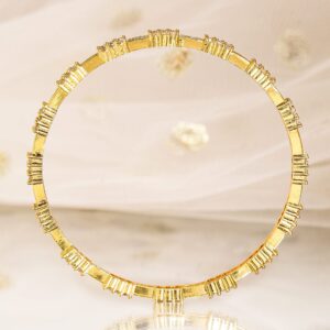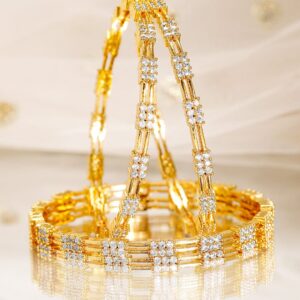A set of 4 stunning handcrafted bangles featuring 22K gold plating and sparkling cubic zirconia stones. Elegant and versatile, these bangles are perfect for enhancing any attire with a touch of luxury. Material: Brass Plating : Gold Plated Net Weight: 53.21 Gram Net Quantity: 4 Bangles Care Label: It is advisable to avoid contact with water and organic chemicals i.e. perfume sprays. Store jewellery in airtight box. After use, wipe the jewellery with soft cotton cloth.
