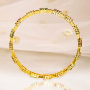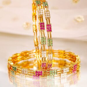 A stunning set of 4 handcrafted 22K gold-plated bangles adorned with vibrant multicolor stones and sparkling cubic zirconia accents. Perfect for elevating your style with a colorful, elegant touch. Material: Brass Net Weight: 52.05 Gram Net Quantity: 4 Bangles Care Label: It is advisable to avoid contact with water and organic chemicals i.e. perfume sprays. Store jewellery in airtight box. After use, wipe the jewellery with soft cotton cloth.