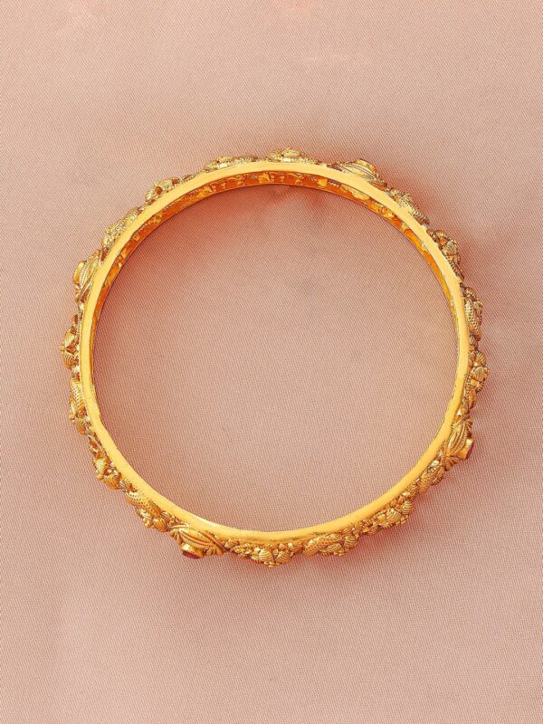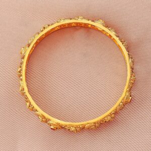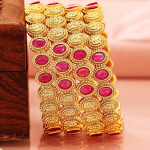 Elevate your ethnic charm with the Set of 4 22K Gold-Plated Bangles. These bangles feature an intricate filigree design that showcases fine craftsmanship, beautifully accented with ruby pink stones for a vibrant and regal touch. The luxurious gold-plated finish adds timeless elegance, making these bangles a must-have for festive celebrations, weddings, or traditional occasions. Occasion :Bring your style to a whole new level with this handcrafted piece of jewellery. When you’re celebrating a special Occasion : – a birthday, wedding, or personal milestone – this piece adds that extra something that makes us feel special and looking our best. Material & Care Material: Brass Net Weight: 47 Gram Net Quantity: 2 Bangles Care Label: It is advisable to avoid contact with water and organic chemicals i.e. perfume sprays. Store jewellery in airtight box. After use, wipe the jewellery with soft cotton cloth.