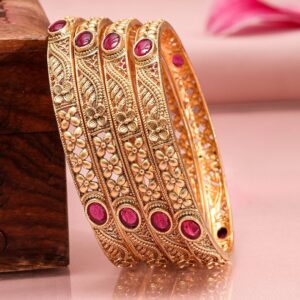 Bangle : Discover elegance with the Gold-Plated design, meticulously crafted for those who cherish luxury. This piece features Ruby and Emerald stones for an eye-catching sparkle, making it perfect for special occasions. With a blend of high-quality materials and exquisite design, it promises both durability and style. The versatile look can complement a variety of outfits, adding a touch of sophistication. A must-have for enhancing your accessory collection with timeless elegance. Occasion : Bring your style to a whole new level with this handcrafted piece of jewellery. When you’re celebrating a special Occasion : – a birthday, wedding, or personal milestone – this piece adds that extra something that makes us feel special and looking our best. Material : & Care Material: Brass Net Weight: 43,88 Gram Net Quantity: 4 Bangles Care Label: It is advisable to avoid contact with water and organic chemicals i.e. perfume sprays. Store jewellery in airtight box. After use, wipe the jewellery with soft cotton cloth.