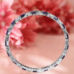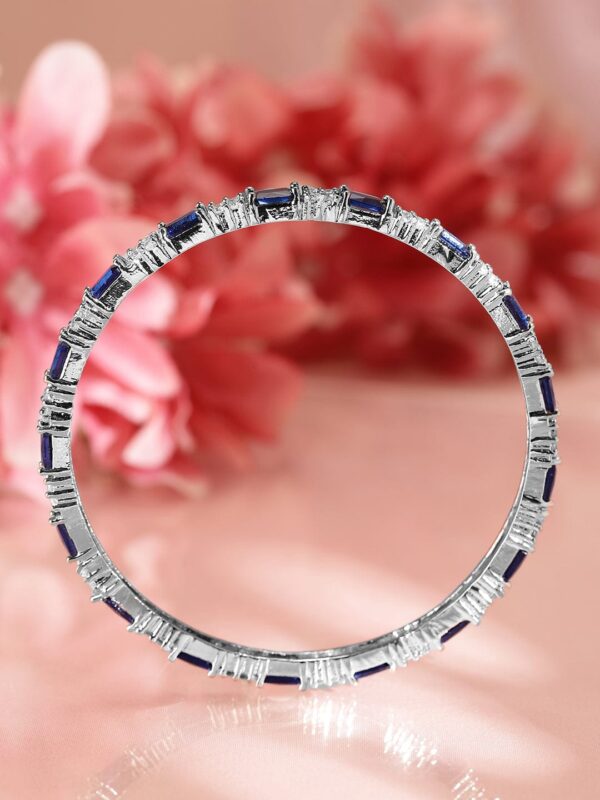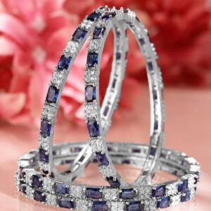 Bangle : This set of 4 rhodium-plated bangles features stunning blue sapphire stones and sparkling cubic zirconia, offering a luxurious and elegant appeal for your jewelry collection. Occasion : Bring your style to a whole new level with this handcrafted piece of jewellery. When you’re celebrating a special Occasion : – a birthday, wedding, parties or personal milestone – this piece adds that extra something that makes us feel special and looking our best. Material & Care Material: Brass Plating : Rhodium Plated Net Weight: 55.07 Gram Net Quantity: 4 Bangles Care Label : It is advisable to avoid contact with water and organic chemicals i.e. perfume sprays. Store jewellery in airtight box. After use, wipe the jewellery with soft cotton cloth.
