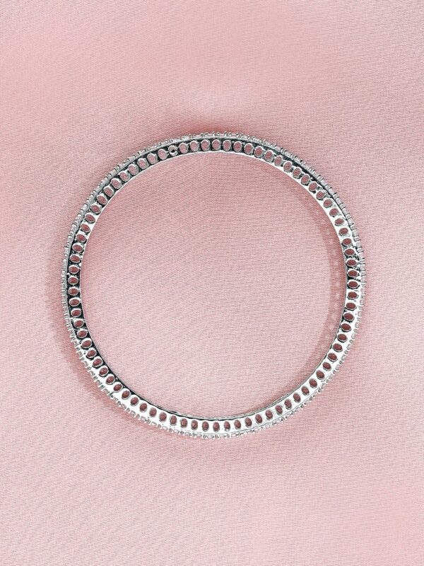 Bangle : Discover elegance with the Rhodium-Plated design, meticulously crafted for those who cherish luxury. This piece features precious stones for an eye-catching sparkle, making it perfect for special occasions. With a blend of high-quality materials and exquisite design, it promises both durability and style. The versatile look can complement a variety of outfits, adding a touch of sophistication. A must-have for enhancing your accessory collection with timeless elegance. Occasion : Bring your style to a whole new level with this handcrafted piece of jewellery. When you’re celebrating a special Occasion : – a birthday, wedding, or personal milestone – this piece adds that extra something that makes us feel special and looking our best. Material : & Care Dimension : Length : 2.4, Width: 2.4 Material :Brass Care Label : It is advisable to avoid contact with water and organic chemicals i.e. perfume sprays. Store jewellery in airtight box. After use, wipe the jewellery with soft cotton cloth.