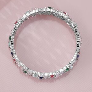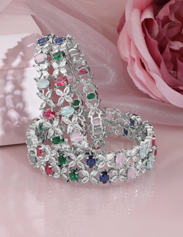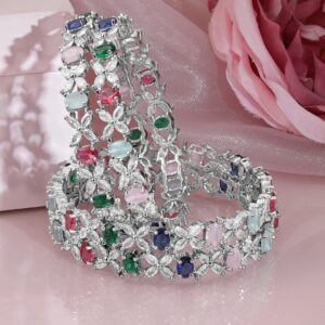 Bangle : Exquisite set of 4 rhodium-plated bangles adorned with multicolor AD stones and cubic zirconia, featuring a beautiful floral design. Perfect for adding a vibrant touch to your jewelry collection. Occasion : Bring your style to a whole new level with this handcrafted piece of jewellery. When you’re celebrating a special Occasion : – a birthday, wedding, or personal milestone – this piece adds that extra something that makes us feel special and looking our best. Material : & Care Dimension : Net Weight: 73.28g Net Quantity: 4 Bangles Material :Brass Care Label : It is advisable to avoid contact with water and organic chemicals i.e. perfume sprays. Store jewellery in airtight box. After use, wipe the jewellery with soft cotton cloth.