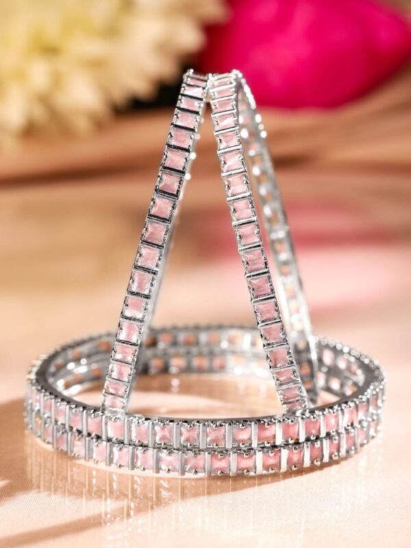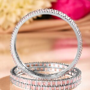 This set of 4 handcrafted rhodium-plated bangles features stunning pink cubic zirconia stones, exuding elegance and grace. A luxurious statement piece ideal for festive and wedding occasions. Occasion : Bring your style to a whole new level with this handcrafted piece of jewellery. When you’re celebrating a special Occasion : – a birthday, wedding, or personal milestone – this piece adds that extra something that makes us feel special and looking our best. Material : & Care Material: Brass Net Weight: 58.38 g Net Quantity: 4 Bangles Care Label : It is advisable to avoid contact with water and organic chemicals i.e. perfume sprays. Store jewellery in airtight box. After use, wipe the jewellery with soft cotton cloth.