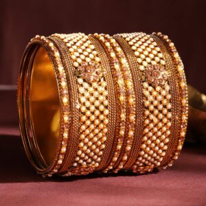The Set of 6, Antique Bangle Pearl Beaded Classy Bangles is a sophisticated and versatile collection of bangles. These antique-inspired bangles feature lustrous pearl beads, adding a touch of timeless elegance to your look. The set of six offers versatility, allowing you to mix and match or wear them all together for a classy and impactful statement. These bangles are an ideal choice for those who appreciate the classic allure of pearls and the vintage charm of antique-style jewelry, making them a cherished addition to your collection. Material & Care Material : Brass Collection : Pearls Beaded Net Quantity: 6 Bangles Care Label : It is advisable to avoid contact with water and organic chemicals i.e. perfume sprays. Store jewellery in airtight box. After use, wipe the jewellery with soft cotton cloth.